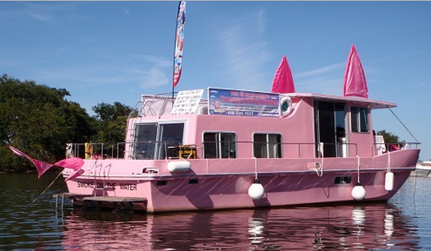 In October of 2012 he purchased a houseboat from Worton Creek Marina. The interior was gutted, and painted inside and out. He added 3 refrigerators, a freezer, gas stove, and custom-made grill on the deck. He teamed up with an Elkton High art teacher to design the tail, snout and ears. ( The snout is a collapsible yard can.) The Kent County Health Department had not dealt with “a mobile unit on the water, but Cecil County had, so inspectors from both counties worked with Gunner to get his permit. A name the boat contest on Facebook netted a number of possibilities. Some of the runners-up: Porky’s Revenge, Oink Oink Splash, When Pigs Float, and 50 Shades of Pork (vetoed as not exactly PC). He settled for “Smoke on the Water.“ There were a few setbacks, estimated launch date was prior to Memorial Day Weekend, the traditional beginning of the boating season. She finally went in the water in mid summer, and was selling BBQ the last weekend in August. And how is business? Gunner said that the delivery dingy has quite a few miles on it already.