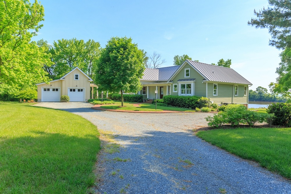This stunning site is elevated above the water of a tidal lake and the Chesapeake Bay beyond where you can watch the parade of silent ships as they make their way up and down the Bay. The house’s light metal roofing reflects the light to keep the house cool and the light color palette contrasts with the surrounding trees and landscape to create a picturesque setting. I loved the night shot of the house’s front elevation with the front porch and breezeway lighting and how the lighting accentuated the house’s geometry with the two end gables and the gables of the garage. I also liked the contrast between the lap siding of the house and the board and batten siding of the garage.