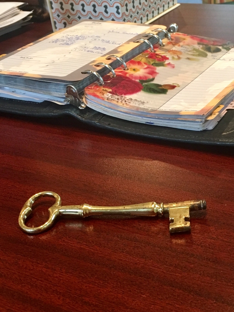 The key sits on my desk and nearly once a day a student picks it up, turns it over longingly, and asks about it. I like to say that the key was given as a gift by a student and it symbolizes opening the door of learning or unlocking learning. This always brings a smile to the face of the student standing across my desk.