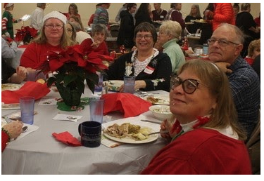 Yvonne Arrowood, who began the Christmas feast in 1984, has been the central figure for its entire run. The feast has been held every year except for a few years hiatus before being revived about a dozen years ago by former pastor Rick Vance. This year was a special dinner for Yvonne as she has announced that it will be her last as the chair though she intends to stay involved while handing over the leadership. Yvonne’s son, Bill Arrowood, spoke about the history of the feast and presented his mother with a bouquet of flowers in appreciation of her efforts over the years. He remembered that his job as a youngster at the first dinner in 1984 was to help run the elevator. Now he notes there is another young family member running the elevator. Life moves on.