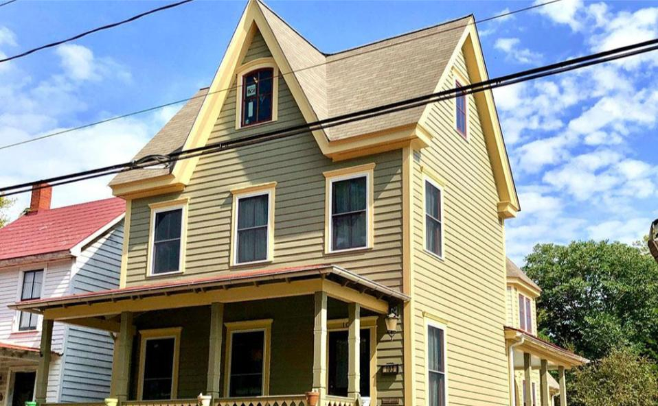 As an architect whose specialty is housing, I am especially interested in infill housing in an Historic District and this charming infill house built in 1995 with Victorian touches caught my eye. The three story three bay house’s front elevation has great architectural appeal with its full front porch and hipped metal roof, symmetrical alignment of entry door and windows and the third floor steep gable with an arched window. The exterior color palette of light green and pale yellow and the historically correct trim, especially the front porch fretwork railing and the articulated columns, also add appeal. I appreciated how the half-French vintage style entry door is located at the driveway side of the house to maximize not only the planting beds that separate the house from the sidewalk but also the floor space of both the front porch and the living room beyond.