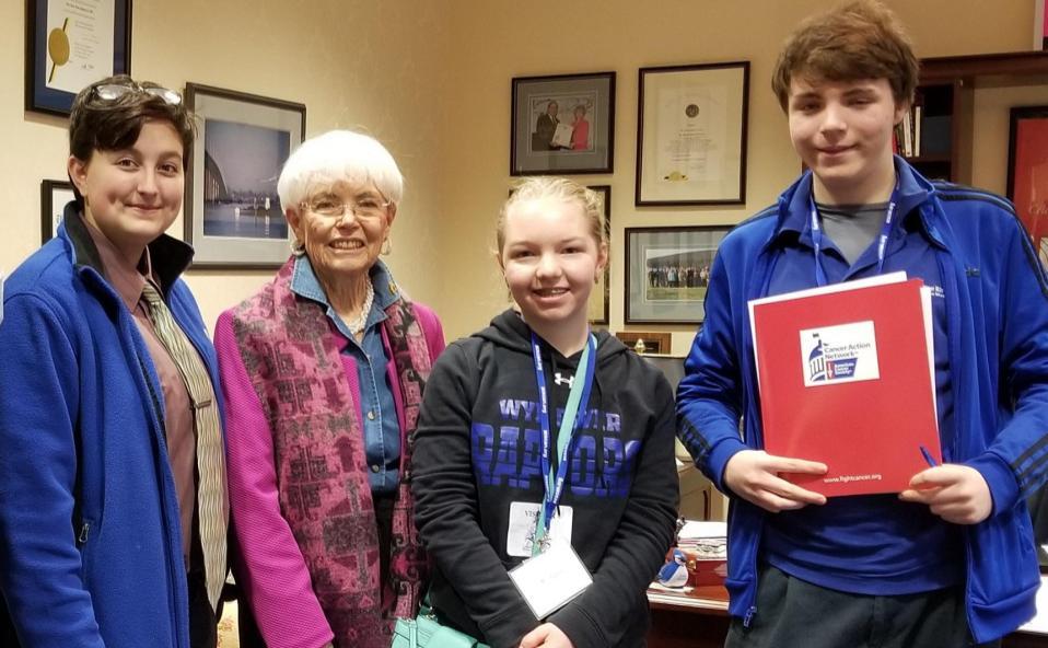 Wye River students Sam of Dorchester County, Nadia of Calvert County, and Ian of Talbot County lobbying at the State House with Senator Adelaide Eckardt.
