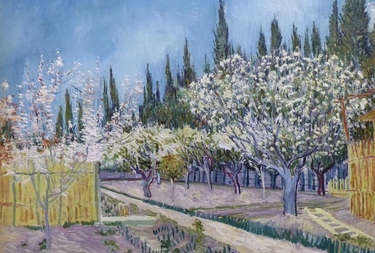 Van Gogh was passionate in all things, and he fell in love with the flowering orchards that signaled the arrival of spring, for him the start of a new life. He began a series of paintings depicting the lush blooming orchards of plum, peach, pear, almond, and apricot. In March 1888 he wrote to Theo: “This country seems to me as beautiful as Japan in its limpid atmosphere and gay color effects. Water forms patches of beautiful emerald or rich blue in the landscape, just as one sees in Japanese prints. The sunsets have a pale orange hue that makes the fields appear blue. The sun, a splendid yellow. In all of nature, in trees for instance, I see expression and a soul, as it were.”