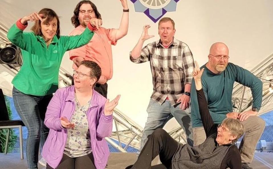 Photo: Shown practicing the freeze frame game “Pictures from our vacation” are (left to right), back row, Nancy Andrew, Jeremy Hillyard, Dan Brown, and Howard Townsend; front row, Heather Hall and Linda Mastro. Photo credit: Val Cavalheri.