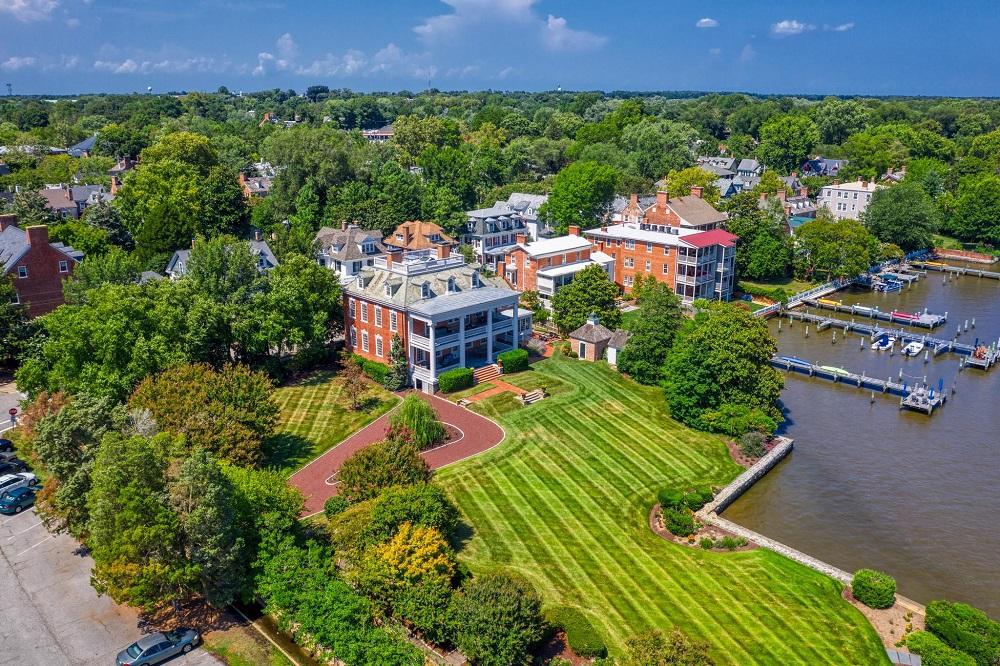 “Widehall” is one of the largest five-bay brick Georgian style houses along the Chester River and its corner location off High Street provides additional prominence. Its exterior color palette of red brick with white window frames, trim, superimposed keystones at the window headers, roof dormers and the Widow’s Walk railing is classic. The front door is centered in the middle bay, surrounded by a Doric style architrave supporting a full pediment with fluted columns below. The windows have twelve-over-twelve sashes whose louvered shutters were added later. In the 1910 restoration, both the two-stored kitchen wing on the northeast side and the magnificent waterside Ionic two-story portico that spans the full length of the house were added.