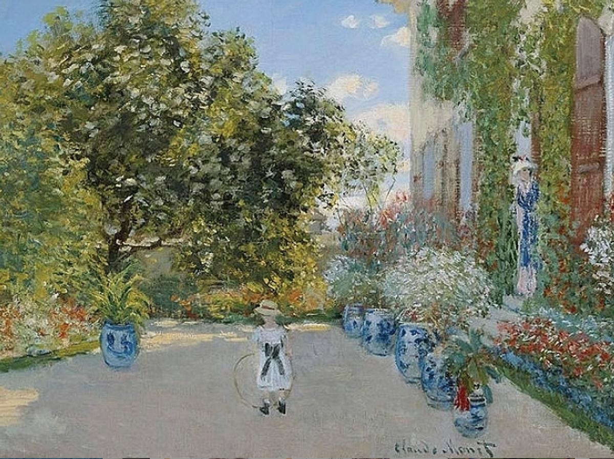 Monet and his family settled in Argenteuil in 1871, after spending almost two years in London, where he fled to avoid the Franco-Prussian war (1870-71). Argenteuil was down the river from Paris. Monet reengaged with his fellow artists, among them Pissarro, Degas, and Renoir. During this period, Monet and the others experimented with the style that would be called Impressionism. Painting in plein air, Monet depicted light and shadow using only the colors that appear in sunlight: purple, blue, green yellow, orange, and red.  Jean’s white outfit is tinted with blue for the shadows and touches of orange for the highlights. Likewise, the earth, largely in shadow, is composed of a mixture of blues and oranges that when mixed create a light brown. Since light, shadow, and wind constantly change outside, Monet used a flickering brush stroke full of paint to give the landscape the sense of the movement he saw. “The Artist’s House at Argenteuil” and Monet’s famous “Impression Sunrise” (1872) were among his works in the first Impressionist Exhibition of 1873.