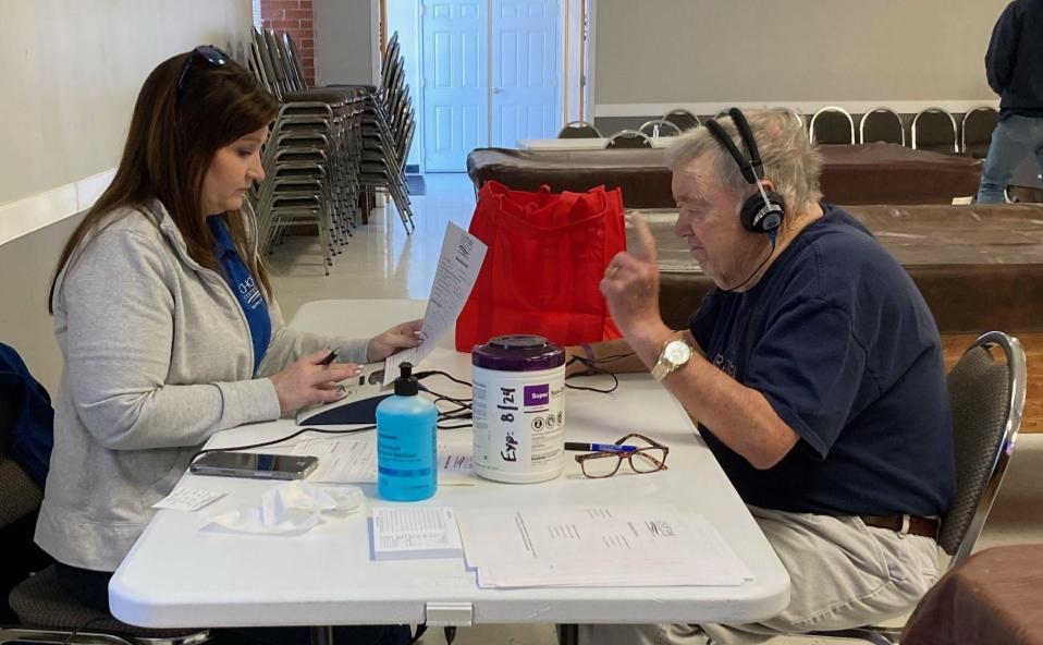 Kira Thrift, NP, a primary care provider with Choptank Community Health Services, gives a hearing test to Jerry Spencer.
