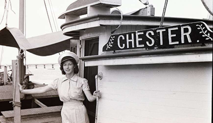 In this week’s Flashback Photo, we look forward to summer days on the Chester and the Bay, following the lead set by Captain Lillie Mae Flowers, pictured here circa 1939 aboard her vessel Chester. At the age of 22, Flowers became the youngest female sea captain, according to The Kent News of Saturday, July 22, 1939, which called her “A comely lady, slight and lissome.” The 1989 announcement of her death in a local newspaper noted that she “had been to the East Indies and sailed through storms. Chesapeake Bay storms, she said, were the worst of all.” The same article reported that she was the subject of a question on the television quiz show Jeopardy! but none of the contestants could name the youngest female sea captain.