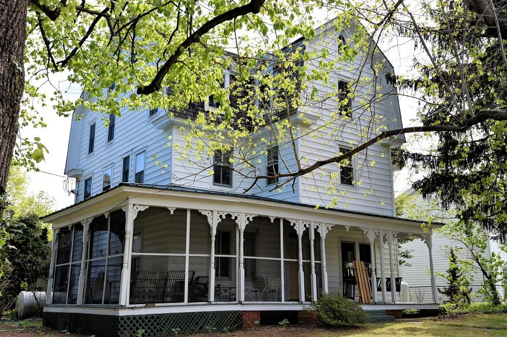 In the days before the Bay Bridge, when the ferries transported vacationers to the Eastern Shore beaches to escape the urban heat of Baltimore, this building was a popular boarding house named ‘Price Cottage”. A vintage postcard from 1906 shows an open hipped roof front porch and columns with Victorian fretwork. The message read ” Very Nice Place” and it certainly retains its charm today. The upper floor of the huge three-bay barn behind the house was used as a dormitory for the female workers who worked during the summer season. In the early 1920’s the third floor of the house was raised to create more rooms. The “T” shaped house has a one-story shed roofed addition at the leg of the “T” and it is easy to imagine how a weary traveler would have been immediately charmed by the gambrel roofs and wrap-around porch to catch the summer breezes.