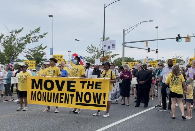 Hundreds march Saturday, June 19, to the courthouse on Washington Street in Easton to urge Talbot County to remove the Confederate monument from the courthouse lawn. Music by Friends for Christ.