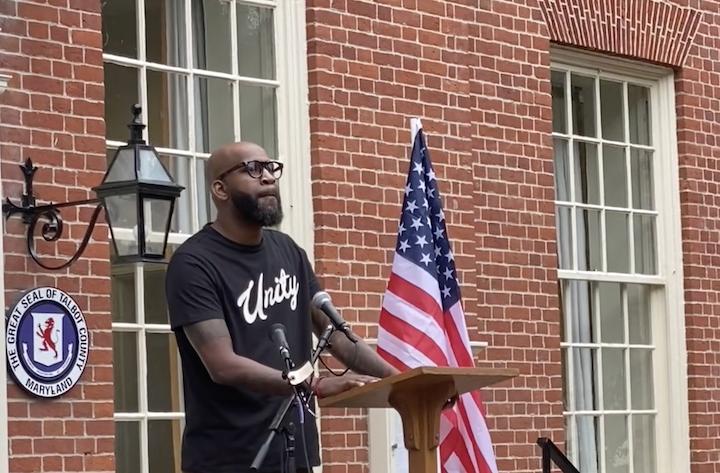 Speakers at a Saturday, June 19, rally note the designation of Juneteenth as a federal holiday and urge the Talbot County Council to move the Confederate monument from the courthouse lawn.