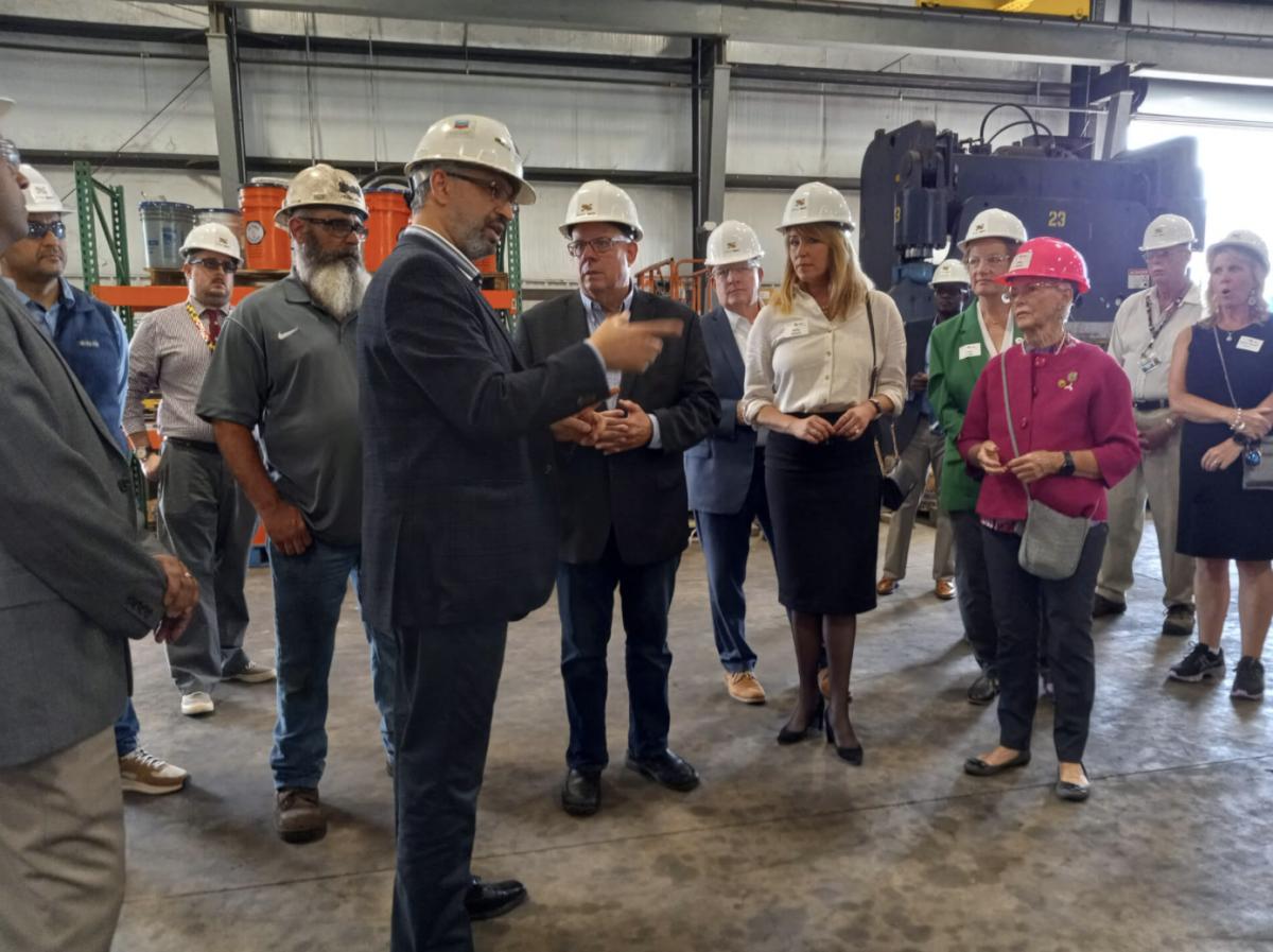 Before announcing the deal, Hogan and other dignitaries toured the Crystal Steel facility, seeing where different phases of component work would take place. Later, two welders symbolically fused the corporate logos of the two companies together onto a steel map of Maryland.