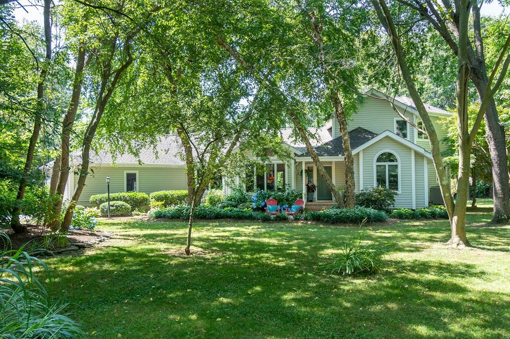 Once again, I find myself in the very appealing Wymont Park neighborhood of NW Kent County, whose water boundaries are Jacks Cove and Still Pond Creek leading to the Chesapeake Bay. The water oriented community neighborhood has both waterfront lots and inland lots including today’s feature. This custom built contemporary style house was built in 2004 with the use of structurally integrated panels. What caught my eye was its setting, nestled in a clearing of woods, surrounded by dense foliage of tall trees and mature landscaping. The light colored exterior color palette and the geometry of the house with its many gables, bay projections and angled walls reach out to the landscape against this verdant oasis’ backdrop of green.