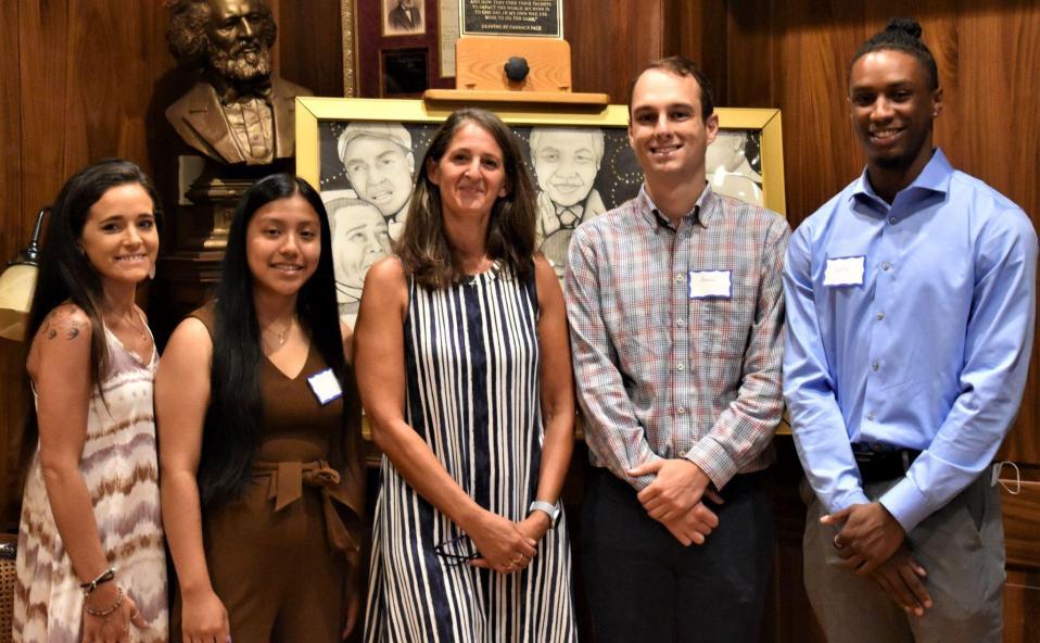 Sandy Brown, center, stands with Mid-Shore Pro Bono’s Sandy Brown Public Interest interns at a recent networking luncheon for the interns at the Frederick Douglass Room of the Talbot County Free Library in Easton, Md. From left are interns Elliett Earhart and Naiset Perez, Brown, and interns Joshua Goslee and Brandon Ewing. Not shown is Megan Rayfield.