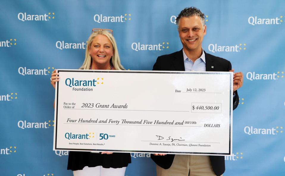 Foundation Board Vice Chair Amanda Neal and Qlarant CEO Dr. Ron Forsythe, Jr. present a check for $440,500 in this year’s Qlarant Foundation Grantee program.